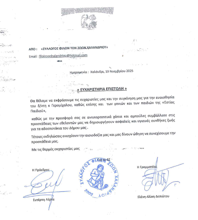 Η Εστία Παιδιού έχει την χαρά να μοιράζεται με όλους σας την ευχαριστήρια επιστολή που λάβαμε από τον Σύλλογο Φίλων Ζώων Χαλανδρίου.